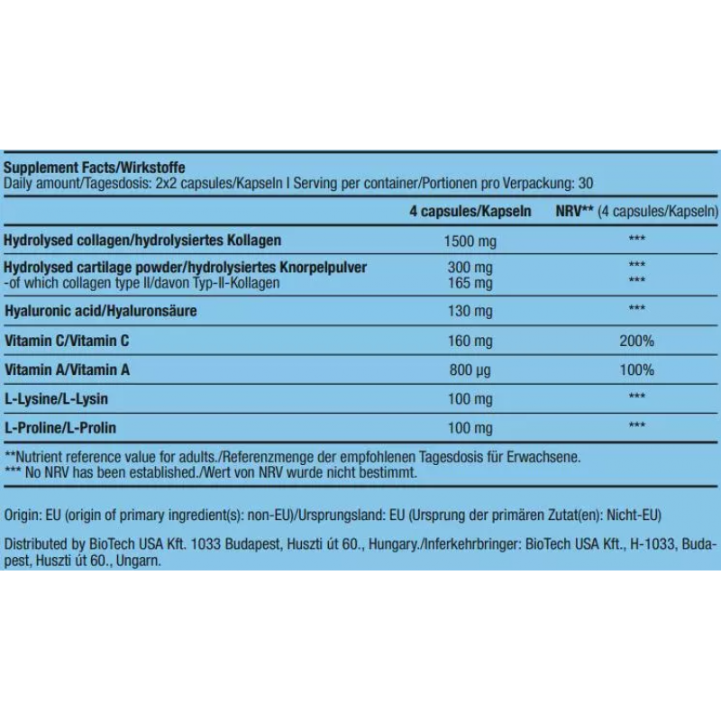 BioTech USA Hyaluronic and Collagen - это высококачественная пищевая добавка, созданная для поддержания здоровья кожи, суставов и соединительных тканей. Каждая упаковка содержит 120 капсул, обогащенных гиалуроновой кислотой и коллагеном - двумя важными компонентами для здоровья кожи, суставов и связок. Гиалуроновая кислота способствует увлажнению и упругости кожи, а также помогает снизить суставные боли и улучшить их подвижность. Коллаген является строительным материалом для кожи, суставов, костей, связок и сосудов. BioTech USA Hyaluronic and Collagen - отличный выбор для тех, кто стремится сохранить молодость, здоровье и поддерживать свои суставы в хорошем состоянии.