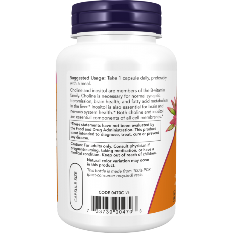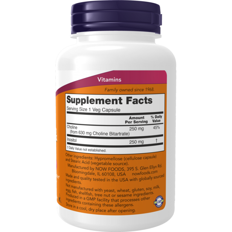 Now Foods Choline & Inositol - это витаминный комплекс группы B, содержащий холин и инозитол, представленный в форме 100 вегетарианских капсул.