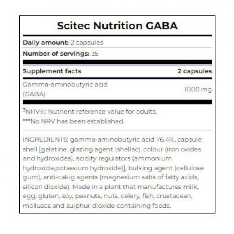 Scitec Nutrition, Gaba изготовлена на основе гамма-аминомасляной кислоты (ГАМК). Гамма-аминомасляная кислота - это природный нейротрансмиттер головного мозга, содержащийся в некоторых продуктах, таких как помидоры, соевые бобы, проросший рис и чайные листья. Гамма-аминомасляная кислота помогает снизить активность нервных клеток в головном мозге и известна своим успокаивающим и расслабляющим эффектом.