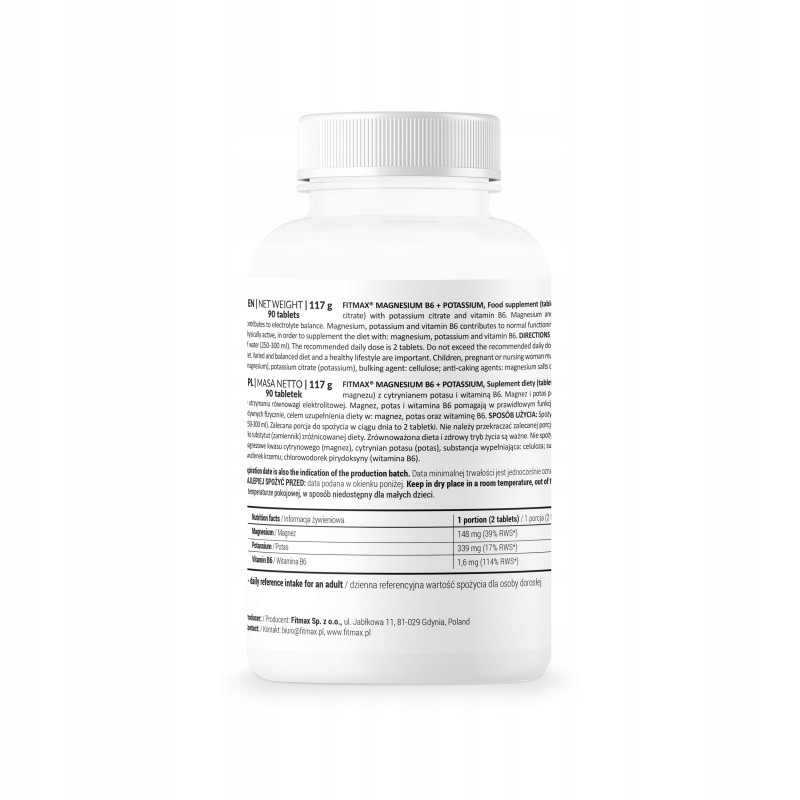 FitMax Magnesium B6 + Potassium - это комбинация цитрата магния с цитратом калия. Эффективность добавки была усилена добавлением витамина B6. Продукт предназначен в основном для физически активных людей с целью дополнения рациона магнием, калием и витамином В6.