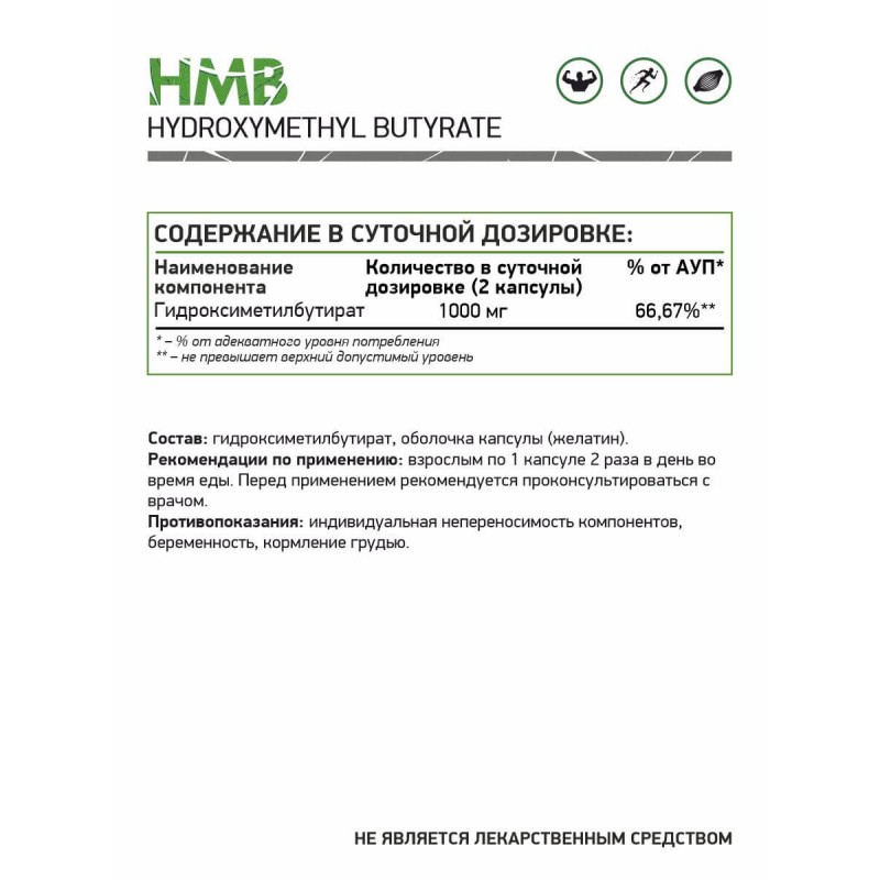 Состав — гидроксиметилбутират, оболочка капсулы (желатин).