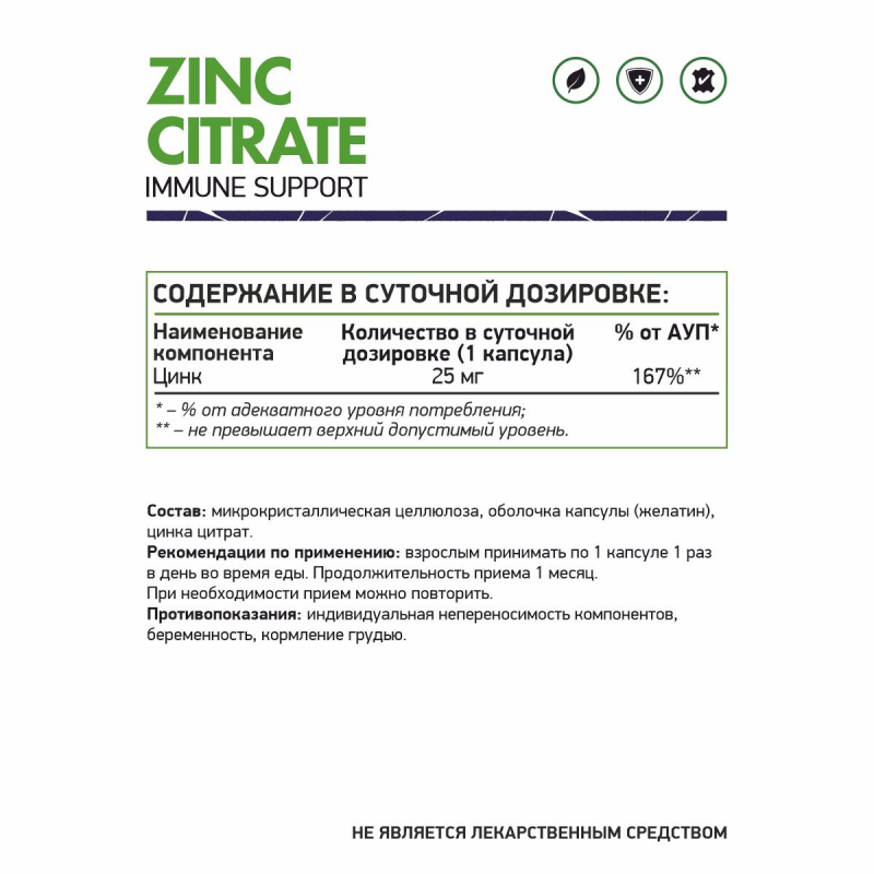Состав — микрокристаллическая целлюлоза, оболочка капсулы (желатин), цинка цитрат.