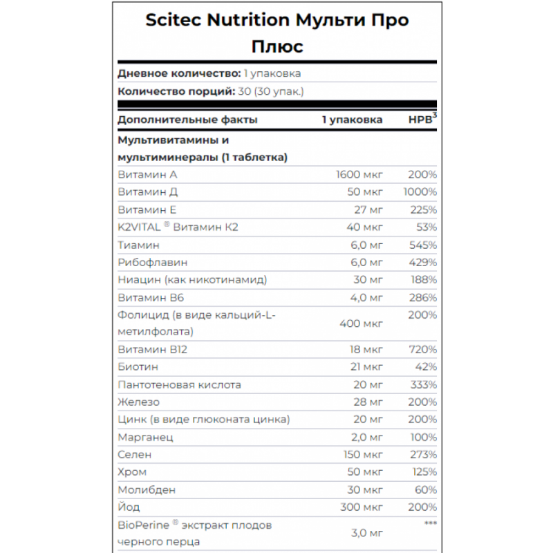 Эта формула предлагает высокую дозировку витаминов группы В и витамина С, плюс необходимые минералы, включая магний, селен и цинк. Витамин С способствует правильной работе иммунной и нервной систем, а также уменьшению усталости и утомляемости. Это также помогает поддерживать нормальную работу иммунной системы во время и после интенсивной тренировки (положительный эффект достигается при приеме 200 мг в день в дополнение к рекомендуемому суточному потреблению витамина С). Витамин В2 способствует поддержанию зрения и красных кровяных клеток. Фолиевая кислота способствует правильному синтезу аминокислот. Multi Pro Plus содержит 250% рекомендуемой дневной дозировки витамина D3. Витамин D способствует поддержанию работы мышечной и иммунной систем и усвоению кальция и фосфора.
