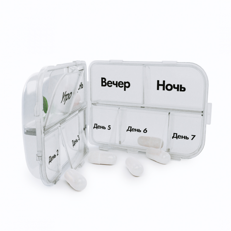 Таблетница NaturalSupp представляет собой практичное решение для тех, кто принимает несколько добавок или лекарств, и желает организовать их прием в удобное и структурированное расписание.