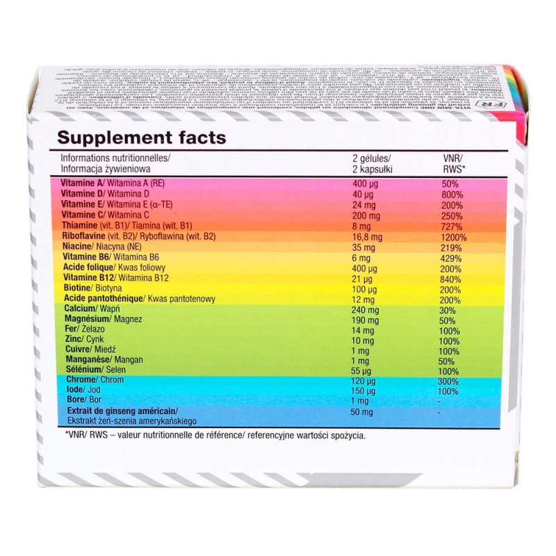 Состав : карбонат кальция, оксид магния, L-аскорбиновая кислота - вит. C, наполнитель - целлюлоза; DL-альфа-токоферилацетат - вит. E, глюконат цинка, экстракт корня американского женьшеня (Panax quinquefolius L.), фумарат железа (II), никотинамид - ниацин, цианокобаламин - вит. В12, рибофлавин - вит. B2, ретинилацетат - вит. А, холекальциферол - вит. D, D-пантотенат кальция - пантотеновая кислота, селенат натрия (IV), глюконат меди (II), мононитрат тиамина - тиамин (витамин B1), гидрохлорид тиамина - тиамин (витамин B1), гидрохлорид пиридоксина - витамин B1 B6, глюконат марганца, борная кислота, D-биотин - биотин, хрома (III) хлорид, птероилмоноглутаминовая кислота - фолиевая кислота, калия йодид, антислеживатели - диоксид кремния, магниевые соли жирных кислот; капсула (желатин, краситель: Е 172).